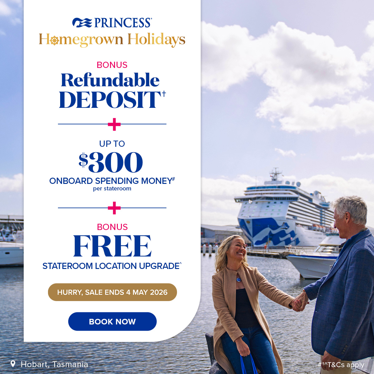 Offer starts 30 April 2026 12:01 AEST and ends 4 May 2026 23:59 AEST. Advertised fares are available until allocation is exhausted and may fluctuate. Offer available on all fare types. ⴕReduced refundable deposit: Pay a reduced (refundable) 10% deposit per person for the first two guests only. Any additional guests must pay the full standard deposit at the time of booking. For guests 1 and 2, the remaining balance of the standard deposit is due with the final payment. This offer is not valid for bookings made within the final payment period or for World Cruises. The deposit is refundable up to the applicable cancellation date under Princess’ standard cancellation policy, as set out at princess.com/en-au/plan/standard-cancellation-refund-policy.